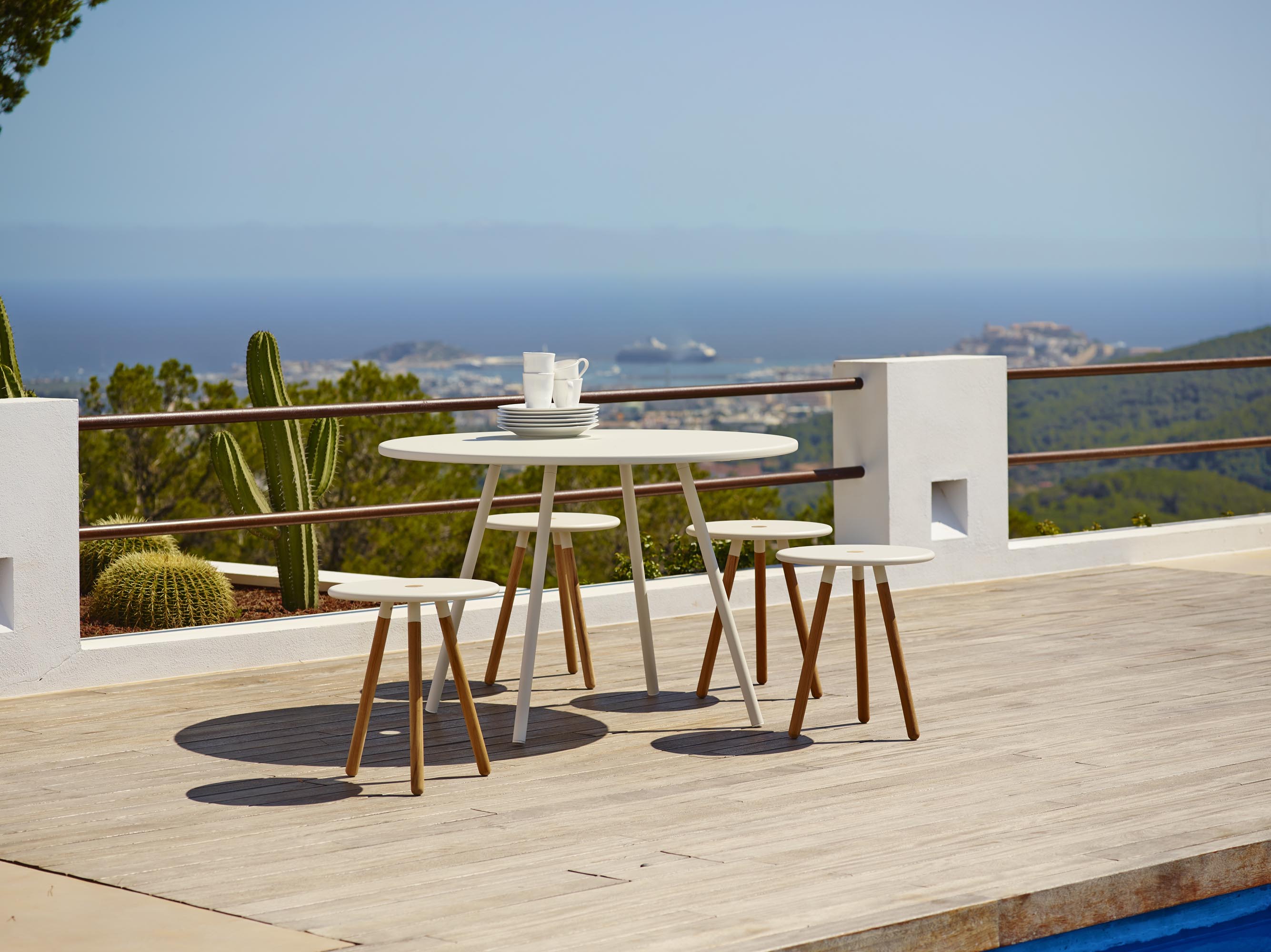 Bordene i Area-kolleksjonen er laget av aluminium og finnes i fargene lavagrå og hvit, med en skikkelig diameter på 110 centimeter, som gjør at hele familien får plass. Bordene er også utstyrt med et hull i midten hvor en parasoll får plass dersom du ønsker litt beskyttelse mot sol og regn. Krakkene har en aluminiumsplate, tilgjengelig i samme farger som bordene, med teakbein som skaper en fin kontrast.