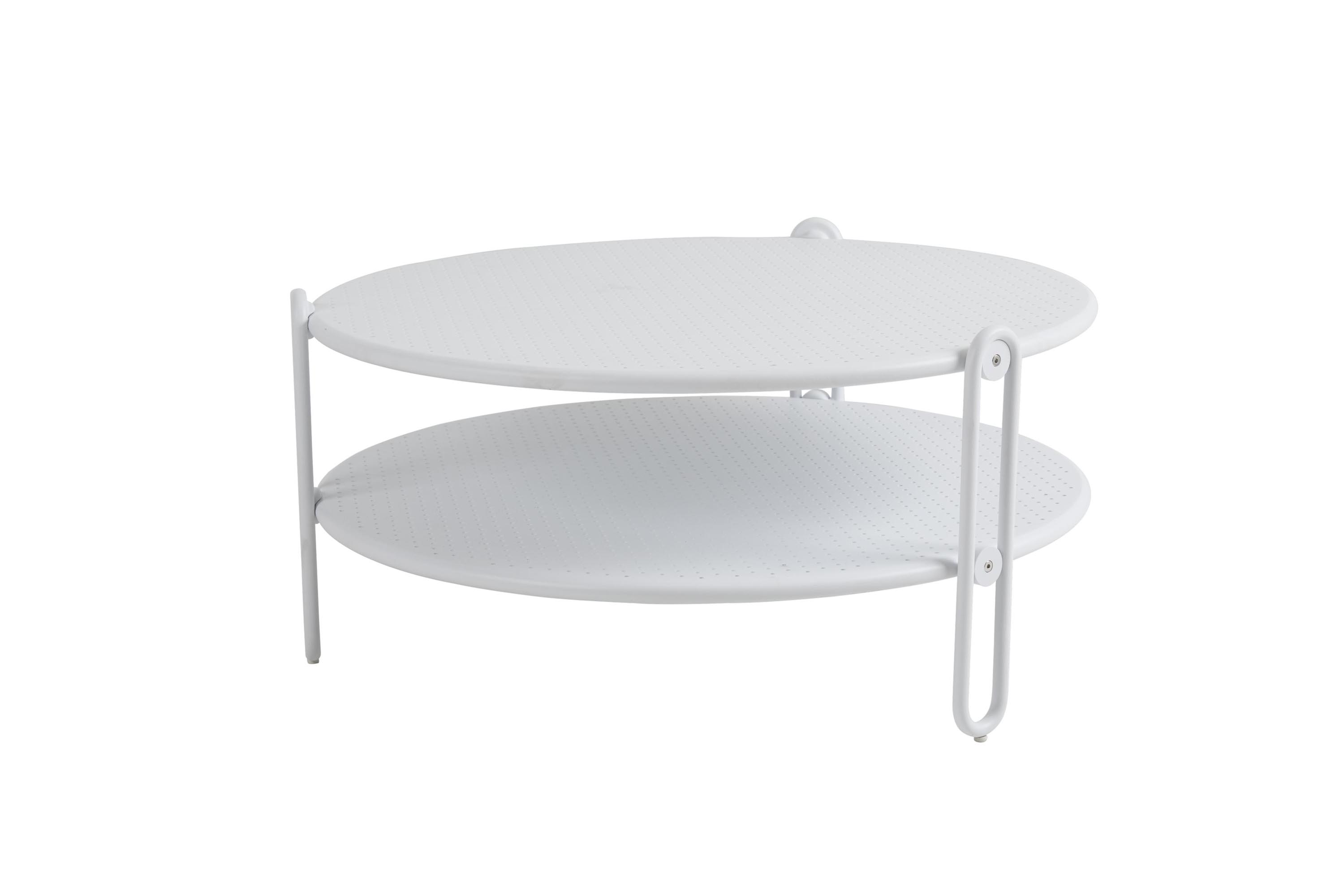 Det runda Blixt soffbordet finns i två höjder och storlekar; ett högre (42 cm) med en diameter på 65 cm och ett lägre (39 cm) med en diameter på 85 cm. De två runda metallskivorna i olika nivåerna är perforerade – en detalj som både är snygg och praktisk. Finns i mattsvart och vitt. Passar en och en eller i par – storlekarna kan de delvis överlappa varandra tack vare en liten skillnad i höjden.